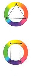 Согласно существующей цветовой теории, сочетание двух противоположных цветов, либо трех в равностороннем треугольнике называется гармоничным. Точно также гармоничными будут любые четыре цвета, образующие прямоугольник, т.е. две диаметрально противоположные пары.